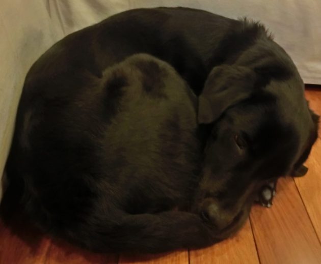 猫はこたつで丸くなると言いますが、我が家では犬が床で丸くなっています。