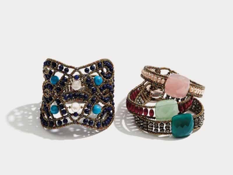 ピンク、ブルー、グリーン石付きブレス各3万8000円、ターコイズ入りブレス7万2000円(共にジーオ/ハリス グレース青山店)