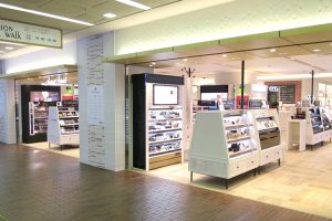 「2階 ファッションウォーク アミューズ ボーテ」ブランドの垣根を越えあれこれ試せる、国内外20ブランド以上を展開するセミセルフ型のコスメショップ。駅構内にあり、通勤・通学などで駅を利用する人々の注目を集めている。