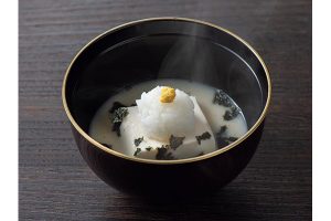 3.白味噌を1に溶き入れ2の冷やご飯にかからないように注ぐ。からしをのせ、焼き海苔をもんで上から散らす。