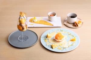 柚子を丸ごと使ったグルテンフリーのクレープ生地に、クレームフロマージュを合せた。添えた伊予柑と苺のジャスミンコンポートはそのままでも、好みでクレープに包んでも楽しめる。