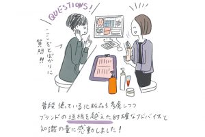 最近のデパートのコスメ売り場は、さまざまな体験ができる。そんな噂を聞き、イラストレーターの田中麻里子さんが訪れたのが、そごう横浜店の〈ソゴウキレイ ステーション〉。専用機器を使った肌解析を無料で受けられるうえ、ビューティーアドバイザーが化粧品フロアにある約70のブランドの中から最適なアイテムを紹介してくれる。