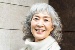 淡いベージュを利かせた髪色。肌なじみがよく若々しさも増し、ひと味違うグレイヘアが目を引く。「白髪染めをやめると決め、雑誌で探して『えがお美容室』へ。担当の照井さんのすすめでベージュを入れたら、周りから好評です」とにっこり。当分この色を楽しむつもりだそう。
