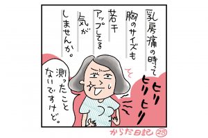 ホットフラッシュがひどく、婦人科でHRTを始めました。すぐに症状はおさまったのですが、乳房が張るのが気になって2カ月でやめてしまい、それ以来、婦人科にも行かなくなっています。やめたとたん、ホットフラッシュは再発しています。乳がんの検診は、HRT開始前に婦人科で受けて問題なし。それまでも、2年に1回の検診は受けていました。閉経はまだですが、月経は間遠になっています。(F・Rさん 48歳 会社員)