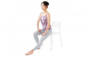 1.椅子にやや浅く腰掛けて左脚を前方へぴんと伸ばし、背筋をしっかり正す。手は軽く太ももにのせる。