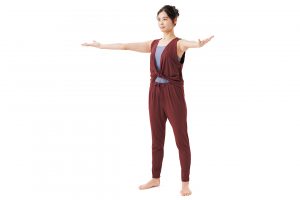1.両脚を肩幅程度に開く。両腕を肩と同じくらいの高さで広げ、手のひらを上に向ける。