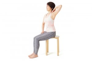 椅子に座り、左肘を前に出す。そのままの姿勢で息を吸って吐きながら、頭をやや下げて背中は丸め、首と肩の力を抜いて全身を脱力させる。息は吐き切る。