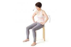 椅子に座り足は腰幅程度に広げ、両手は腰におく。正面向きのまま、腰を前後ではなく、横にゆらす。このとき、骨盤を意識しながら腰だけ動かすように。呼吸は自然呼吸でよい。