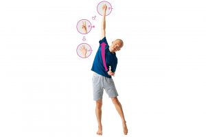 ただ片手を上げるのではなく、反対側の手の小指、薬指、中指を握って(ピストルポーズ)行うと、自然に肩が下がって脇が締まる。上げた手も伸びやすく、脇腹がよく伸びる。