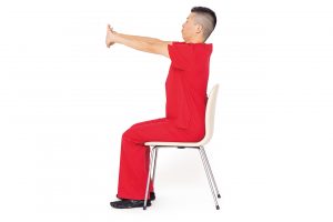 1.まず、椅子に深く腰かけて正しい姿勢で座り直す。足は肩幅くらいに開き、手を組んで手のひらを返し、腕を前に伸ばす。