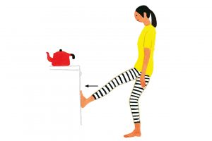 片方の足を上げ、足裏を壁につける。反対の膝は軽く曲げる。壁につけた足裏に体重をかけて数秒静止。左右で行う。ふくらはぎに刺激を与えるため、足裏全体を壁にぴったりつける。痛みを感じる場合は無理せず。