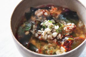 薬膳風、はと麦と鶏ひき肉のわかめスープ【松見早枝子さんのはと麦レシピ】。