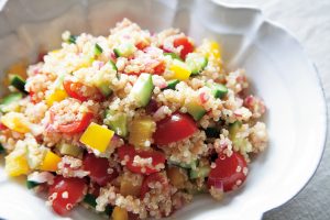 クスクスのサラダも、キヌアで代用すれば栄養価アップ。キヌアは穀物というよりも野菜に近い味わいなので、生野菜との相性は申し分ない。