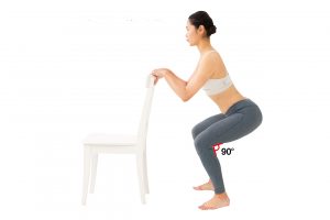 2.息を吐きながら、ひざが90度になるまでゆっくり腰を落とす。ひざが足先より前に出ないように。息を吸いながらゆっくり戻す。1~2を朝晩5回繰り返す。