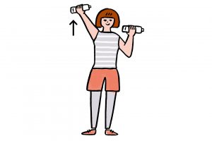 500mlのペットボトルに水を入れると500g。これを両手に持ち、上げ下げするだけでも二の腕に負荷が。振り回すのではなく、筋力で上げること。