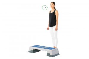 1.踏み台を用意する。踏み台の前に立つ。足を肩幅より狭めに開き、背筋を伸ばす。