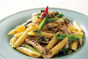 サバ缶と舞茸、青菜のパスタ【牧野直子さんの骨づくりレシピ】。