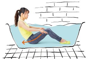 (1)肩までお湯に浸かった状態で、両手を船の櫂のように前から後ろへ動かし水を掻く。膝は軽く曲げて無理のない姿勢で。