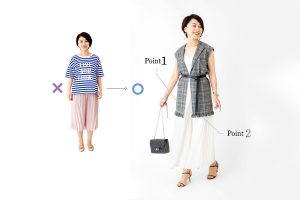 体形をカバーしたつもりで逆効果になっているNG例が、手持ちの服や小物をうまく組み合わせた〝痩せ見え〟コーディネートに変貌!