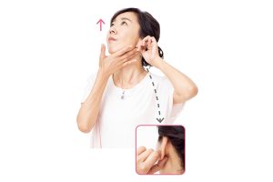 (1)軽く顎を上げて、右手で左顎の下に触れ、顎の下の左右に広がる筋肉(顎舌骨筋)を意識。左手で耳たぶの付け根をやさしくつまみ、弱い力で後ろ側に8回回す。