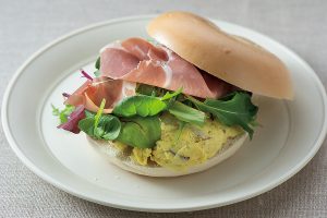 3.ベーグルに2、生ハム、ベビーリーフを挟む。