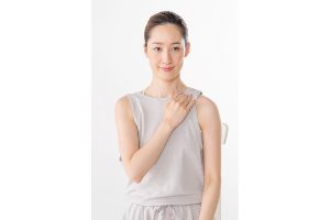 浅い呼吸はのどのつまりの原因のひとつ。鎖骨まわりの筋肉が緊張して硬くなると肩や腕の可動範囲が狭くなり、首まわりの筋肉も固まりがちに。鎖骨を指で押さえながら腕を上げる。これだけで鎖骨周辺の筋肉がほぐれ、深い呼吸が得られるように。