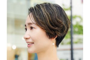 毛流れを引き立てるハイライトがすてきな宮内さん。3年前にショートにして以来、デザインカラーも同時に入れるようになった。「白髪が気になって始めたのですが、動きや立体感も出るので気に入っています」。スタイリングにはジェルを使い、ツヤが増して広がる悩みも落ち着くと重宝。