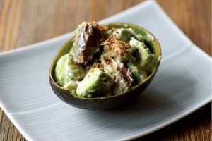 3.ボウルにアボカド、さば、豆乳マヨネーズ(大さじ1~2)を入れて軽く混ぜ、アボカドの皮に盛り付ける。
