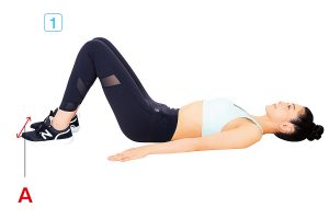 床に仰向けになり、両膝を立てる。両手の手のひらを床につける。お尻を床から引き上げて首から膝を一直線に。5秒維持したら片脚の膝を伸ばして5秒キープを5回。逆脚も。