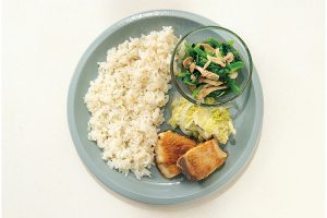 青魚には血液サラサラ効果や認知症予防に有効なDHAとEPAが豊富。シンプルな塩焼きはもちろん、味に工夫を加えることで食べ応えも充実。副菜には味わいの異なる2種を用意。水気が多いものは小鉢に入れると見た目もすっきり楽しめます。