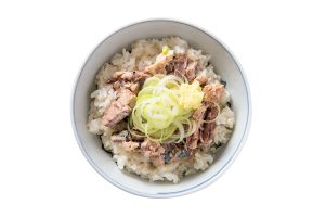 1.胚芽米ご飯に、サバを崩しながらのせて、ねぎ、おろし生姜を添える。