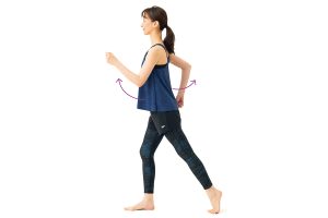 (1)大きく1歩前に踏み出す。肘は90度くらいに曲げ、腕を振る。