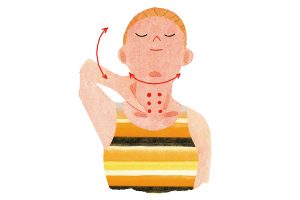 (1)喉より少し外側に右手親指を当て、ほかの指で首の後ろを支える。あごを上げ、10秒間上下左右に首を振る。左手でも同様に。