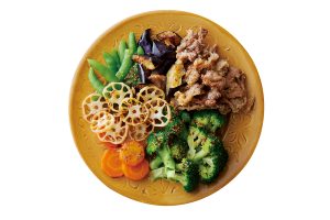 ゆで野菜と揚げ野菜を盛り合わせ、油と好相性のβ-カロテンも効率よく摂れる優秀な一皿です。ビタミンB1が豊富な豚肉の竜田揚げは野菜との相乗効果が期待でき、ボリューム感もアップ。体調を整えて免疫力をサポートし、糖質も効率よくエネルギーに。