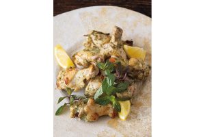 「マリネ液に使用するレモンバームとペパーミントはとにかく香り重視。ヨーグルトとともに手羽元を漬けて柔らかく。清々しい香りに癒やされます」。好みでレモン果汁を搾って。