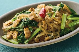 鉄分豊富なあさりと小松菜を組み合わせた一品。あさりの汁の旨味を春雨が吸って、ご飯が進むおいしさに。小松菜のあくが気になる場合は、調理前に茹でるか水にさらすとよい。