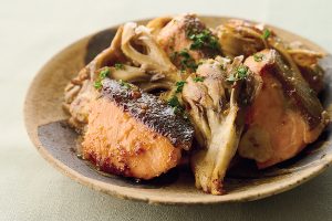 鮭と天日干ししたきのこを組み合わせて、骨作りに大切なビタミンDを摂取。きのこはしめじやエリンギなどでもOK。味噌マヨネーズのまろやかなコクとにんにくの香りが食欲をそそる。