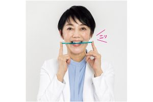 歯ブラシを噛みながらスマイルをキープするトレーニング。口角挙筋や口輪筋などに効き、キュッと上がった口角をのぞめる。「朝の歯磨きのついでに行うといいでしょう。最初はキツいかもしれませんが、効果ばつぐんなので頑張って」