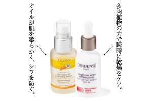 ヒアルロン酸とオイル配合の2層式で、シワに効果的。「目尻や口周り、額の横じわに」。30ml 7,150円(ロゴナ TEL.03・3288・3122)