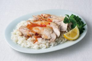 4.鶏肉を取り出して食べやすい大きさに切り、チキンライスと共に皿に盛る。パクチー、くし形に切ったレモンを添え、スイートチリソースをかける。