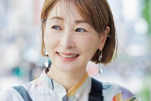 ウエーブヘアが素敵な門脇さんは7年前に白髪染めを卒業。ハイライトを入れて白髪と黒髪をなじませ、地毛の白をデザインとして生かしている。「カラーは3カ月おき、パーマは半年おきに。今の髪型は白髪をポジティブに捉えられるのがうれしいです」