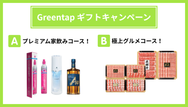 いま、Greentapの水栓を導入すると期間限定キャンペーンの対象に! ミネラル in ウォーターのおいしさを満喫する2つのコースから1つ選んで、必ずもらえます。