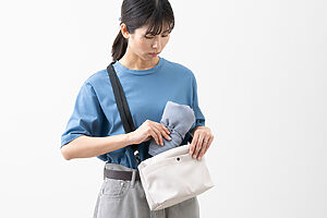羽織ものは持ち運ぶことも多いアイテムなので、小さくたたんでコンパクトにまとめるためにゴムを付けました。折り畳んでもシワになりにくいので安心です。ネットに入れればお家洗いOKですので、いつも清潔な状態で着られます。
