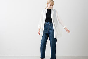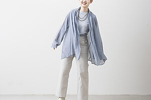 上品な透け感の薄手の一枚。ニットカーディガンと違って肉感を拾わず、ふんわりと体を覆ってスタイルアップを叶えてくれそうです。袖をロールアップして手首周りを多めに出せば、よりこなれた着こなしになるのでは。小さくたたんでバッグに入れておけるから、旅先でも大活躍してくれるはずです。