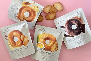 「ベーグルチップ」左上:ハニーバター、左:ガーリックバター、中:コーンスープ、右:チョコシナモン 各397円