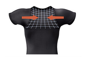1つ目のポイントは、胸を自然に開くように設計された「オープンチェスト構造」。内側に入りがちな肩を外側へと導き、呼吸がしやすく、胸を張った美しい姿勢を自然にキープできます。