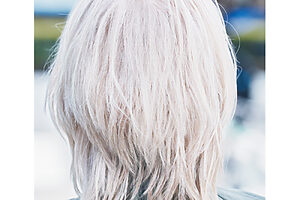 美しいプラチナカラーが目を引く金田さん。ミディアムから切ったのは昨年の冬。「年々うねりが出るようになり、もともと直毛でウルフはサマにならないと思っていたのですが、このうねりがあればできるかも!と」。冬の間はスヌードを巻くと首もとが隠れ、ショートっぽくも見えるのを楽しんでいたそう。