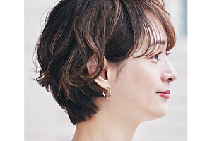 「昨年の冬、ミディアムからばっさり切りました。気分転換には髪を切るのが何よりですね」とお気に入り。首もとがすっきり見えるショートヘアにおしゃれ心もムクムク湧いた松下さん。「少し主張の強いピアスや、色みのあるメイクに挑戦も。短い髪は自然と爽やかさが出るので、気負わずに試せます」