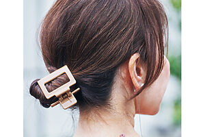 ボディワーカーという職業柄、結べる長さは必須のkyoさん。とはいえ、ただ引っ詰めた髪は好きではなく、上げても下ろしても決まるラフさを探求。「夜、毛先をアイロンで軽く巻いておき、昼間のレッスン中は髪をねじってクリップで留めます。すると外した時にいい具合にふわっとした動きが出るんです」