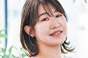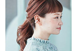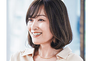 年代的にボリュームの出づらいトップにもカットでレイヤーを入れ、ふんわり感を出した青沼さんのスタイル。「ラテブラウンのベースに、ベージュをスライシング(ハイライトを面で入れる技法)で入れて明るい面積を増やし、全体を軽やかに仕上げました」(今さん)